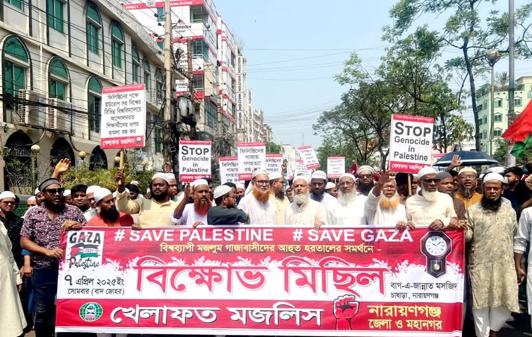 তিনি বলেন, আজ আমরা শুধু সমবেদনা জানাতে এখানে আসি নাই। আমাদের হৃদয়ে রক্তক্ষরণ শুরু হয়েছে। বিশ্বজুড়ে শান্তিকামী মানুষের ক্ষোভের অনল ইসরাইল ও তার পৃষ্ঠপোষকদের অচিরেই ধ্বংস ডেকে আনবে ইনশাআল্লাহ। আজ ৭ এপ্রিল সোমবার বাদ যোহর নারায়ণগঞ্জের চাষাঢ়ায় খেলাফত মজলিস নারায়ণগঞ্জ জেলা ও মহানগর শাখার উদ্যোগে গাজার প্রতি বৈশ্বিক সংহতির অংশ হিসেবে অনুষ্ঠিত বিক্ষোভ মিছিলে প্রধান অতিথির বক্তব্যে তিনি এসব কথা বলেন।
