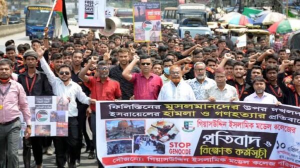 প্রতিবাদ মিছিলের শুরুতে ফিলিস্তিনের শহীদদের স্মরণে বিশেষ দোয়া অনুষ্ঠিত হয়।