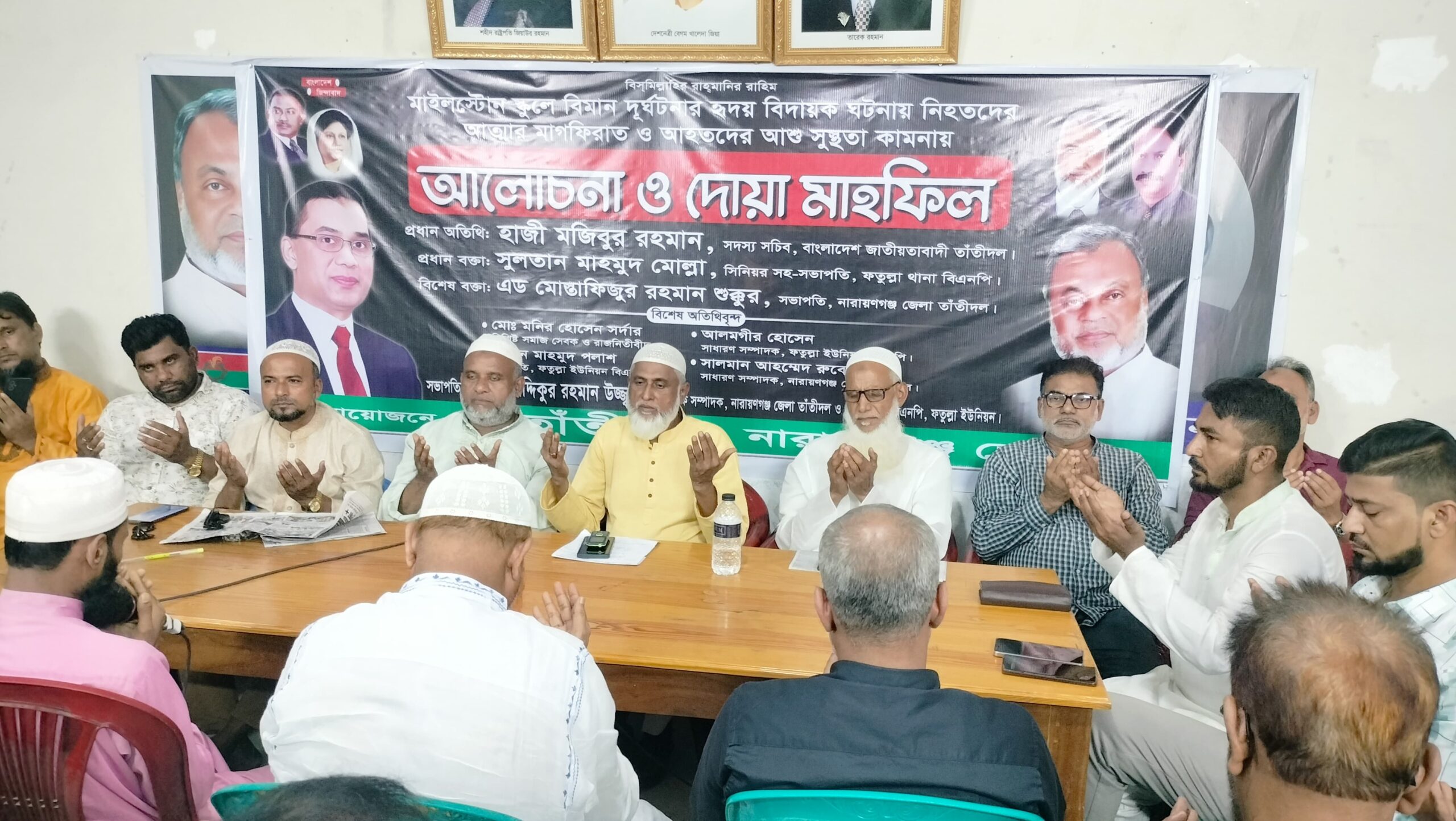 নারায়ণগঞ্জ জেলা তাঁতীদলের আয়োজনে মাইলস্টোন স্কুল এন্ড কলেজে বিমান দুর্ঘটনায় নিহতদের আত্মার মাগফিরাত ও আহতদের আশু সুস্থতা কামনায় আলোচনা সভা ও দোয়া মাহফিল অনুষ্ঠিত হয়েছে।
