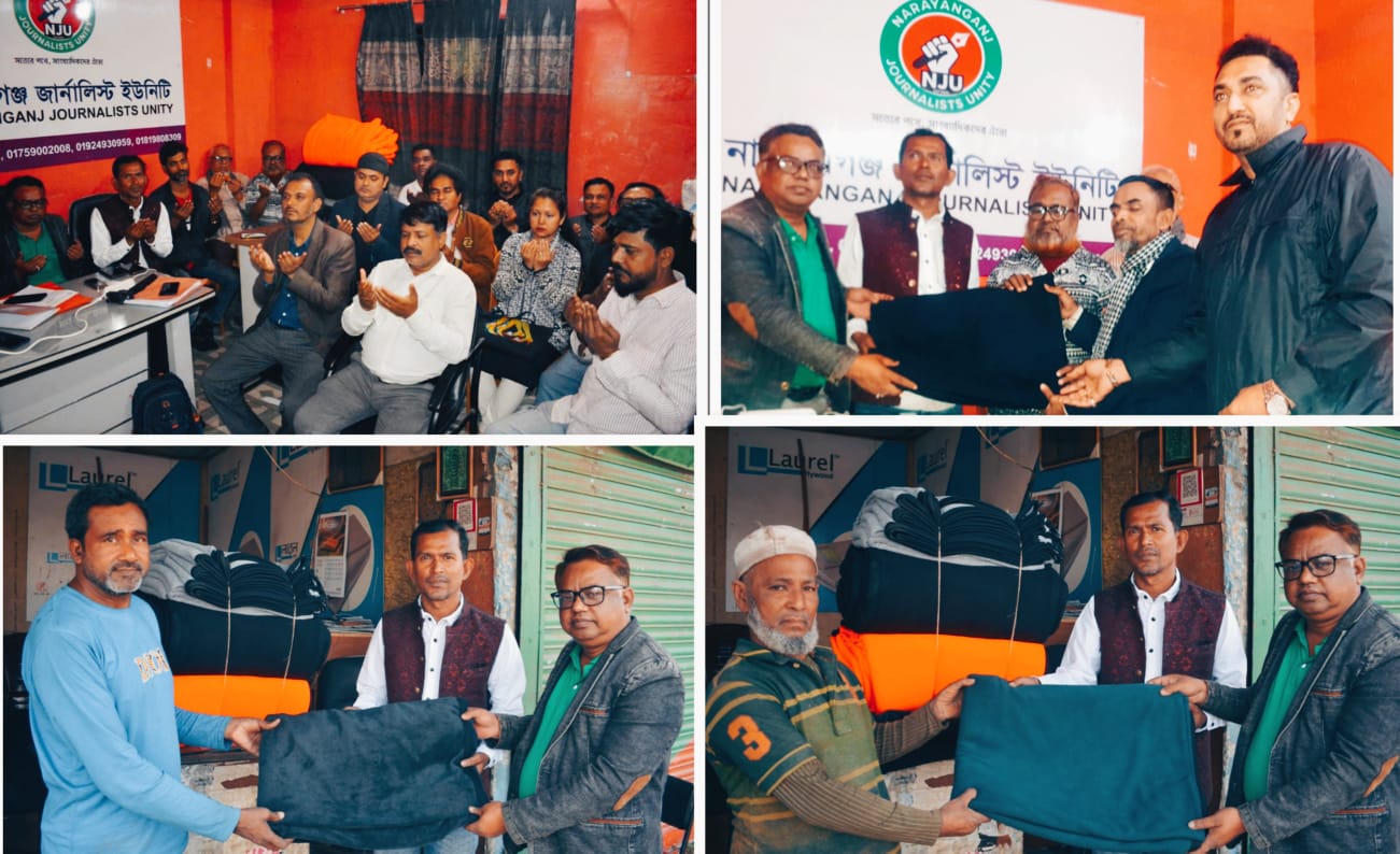 আগামী ১২ ফেব্রুয়ারি অনুষ্ঠিত্ব এয়োদশ জাতীয় সংসদ নির্বাচন -২০২৬ উপলক্ষে নারায়ণগঞ্জ জার্নালিস্ট ইউনিটি (এনজেইউ)'র কার্যালয়ে ইউনিটি'র সদস্যদের উপস্থিতিতে নির্বাচন কালীন সময়ে মাঠ পর্যায়ে তথ্য সংগ্রহ, সম্প্রচার ও জাতীয় নির্বাচন কমিশনার কতৃক ঘোষিত আচরণ বিধি ও দিক নির্দেশনা বিষয়ক এক আলোচনা সভা অনুষ্ঠিত হয়। আলোচনা শেষে অস্বচ্ছল মানুষের মাঝে শীতবস্ত্র উপহার কম্বল বিতরণ করা হয়। পরিশেষে ফটো সাংবাদিক ওয়ারদে রহমান এর মাতার আত্মার মাগফিরাত কামনায় বিশেষ দোয়ার মোনাজাত করা হয়।