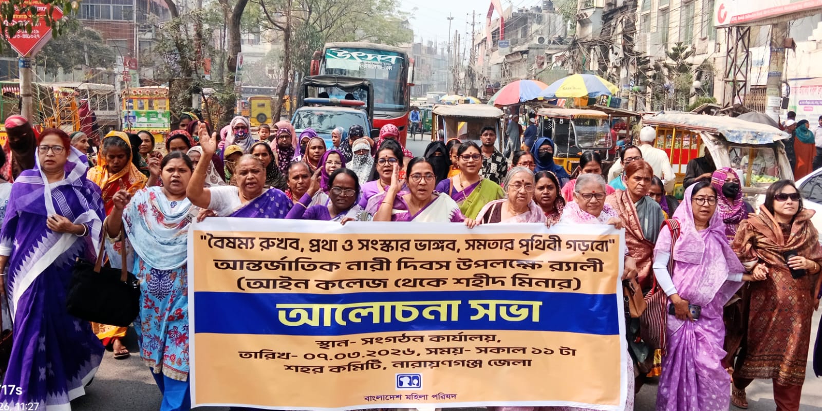 রবিবার ৮ মার্চ বিকেলে বাংলাদেশ মহিলা পরিষদ নারায়ণগঞ্জ শহর কমিটির উদ্যোগে এ আলোচনা সভা ও র্যালী অনুষ্ঠিত হয়েছে।