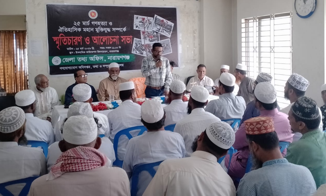 আজ ২৫ মার্চ ২০২৬ ইং নারায়ণগঞ্জ জেলা প্রশাসক মোঃ রায়হান কবিরের নির্দেশনায় নারায়ণগঞ্জ জেলা তথ্য অফিস এর আয়োজনে ২৫ মার্চ ২০২৬ ইসলামিক ফাউন্ডেশন মিলনায়তনে ২৫ মার্চ গণহত্যা ও ঐতিহাসিক মহান মুক্তিযুদ্ধ সম্পর্কে স্মৃতিচারণ ও আলোচনা সভা অনুষ্ঠিত হয়।
