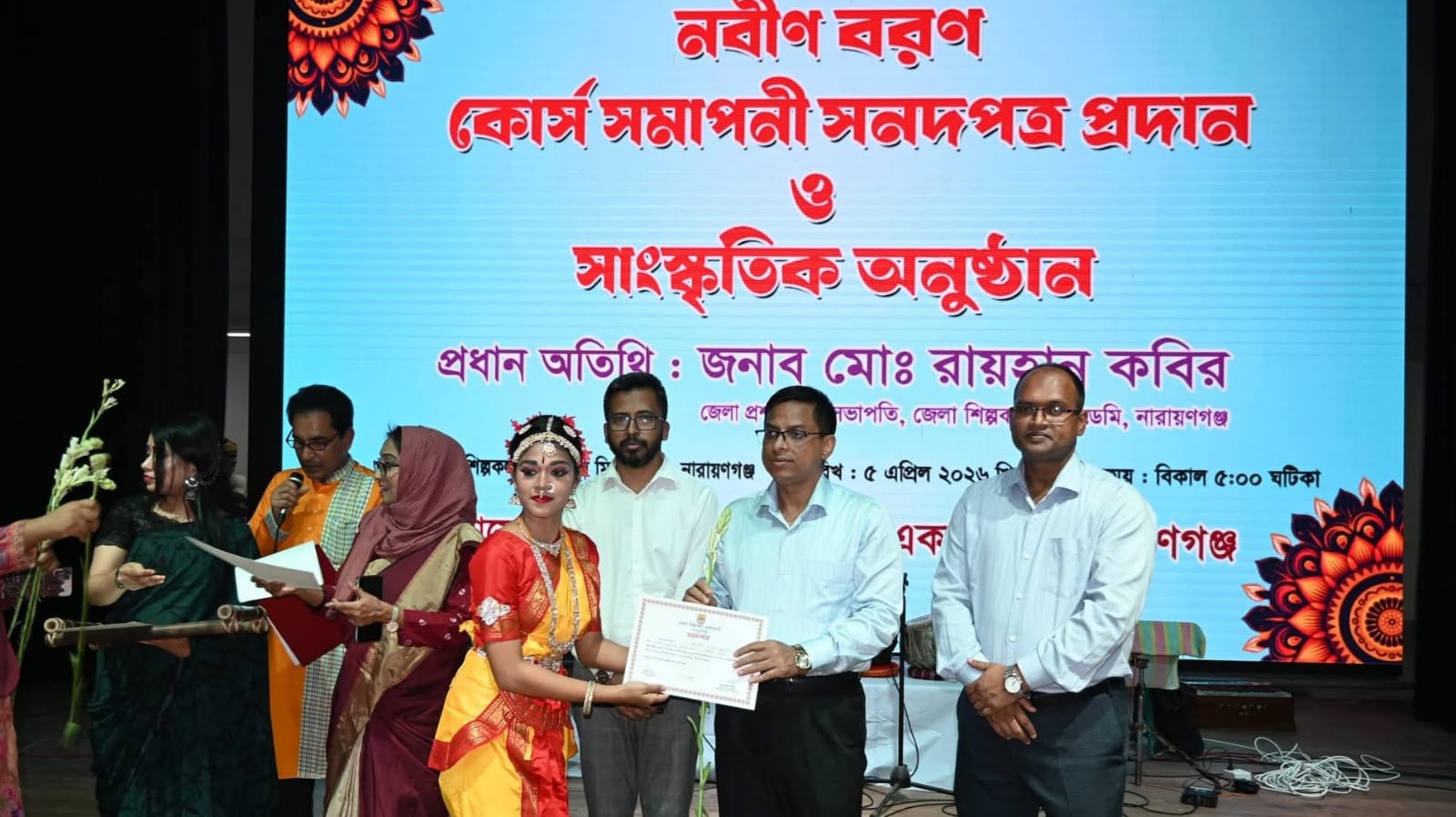 আজ ০৫ এপ্রিল ২০২৬ খ্রি. তারিখে জেলা শিল্পকলা একাডেমির অডিটোরিয়ামে নারায়ণগঞ্জ শিল্পকলা একাডেমী কর্তৃক আয়োজিত "নবীন বরণ ও বিভিন্ন কোর্স সমাপনী সনদপত্র প্রদান সহ সাংস্কৃতিক অনুষ্ঠান অনুষ্ঠিত হয়। উক্ত অনুষ্ঠানে প্রধান অতিথি হিসেবে উপস্থিত ছিলেন নারায়ণগঞ্জ জেলা প্রশাসক মোঃ রায়হান কবির।