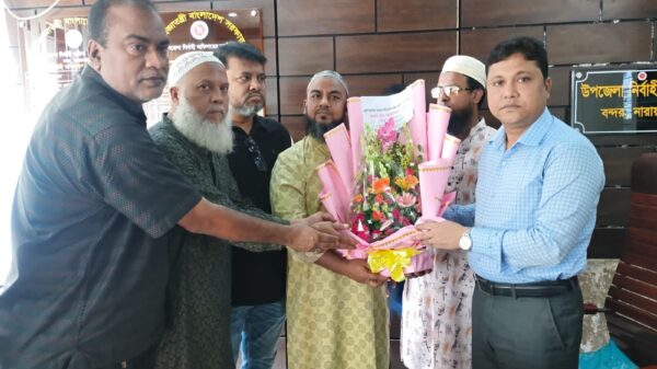 নারায়ণগঞ্জ বন্দর উপজেলা নির্বাহী অফিসার (ইউএনও) মো. মোস্তাফিজুর রহমানের সঙ্গে সৌজন্য সাক্ষাৎ করেছেন র‍্যালী আবাসিক এলাকা বাড়ির মালিক ঐক্য পরিষদ এবং যুব ও সমাজকল্যাণ সংসদ।এসময় তাকে ফুলেল শুভেচ্ছা জানান নেতৃবৃন্দ।সম্প্রতি বহিরাগতদের বিভিন্ন অপরাধমূলক কর্মকাণ্ডের অভিযোগ করেন বাড়ির মালিকেরা।তাদেরকে আস্বস্ত করে ইউএনও জানান, কেউ ভয় পাবেন না,আস্থা রাখুন।সবসময় প্রশাসন জনসাধারণের পাশে আছে।চলমান পরিস্থিতিতে এলাকার বিভিন্ন বিষয় নিয়ে আলোচনা করেন এবং শান্তিপূর্ণ পরিবেশ বজায় রাখতে সকলের আন্তরিক সহায়তা প্রত্যাশা করে বলেন, কেউ ভয় পাবেন না, আস্থা রাখুন।সবসময় জনসাধারণের পাশে আছে প্রশাসন।