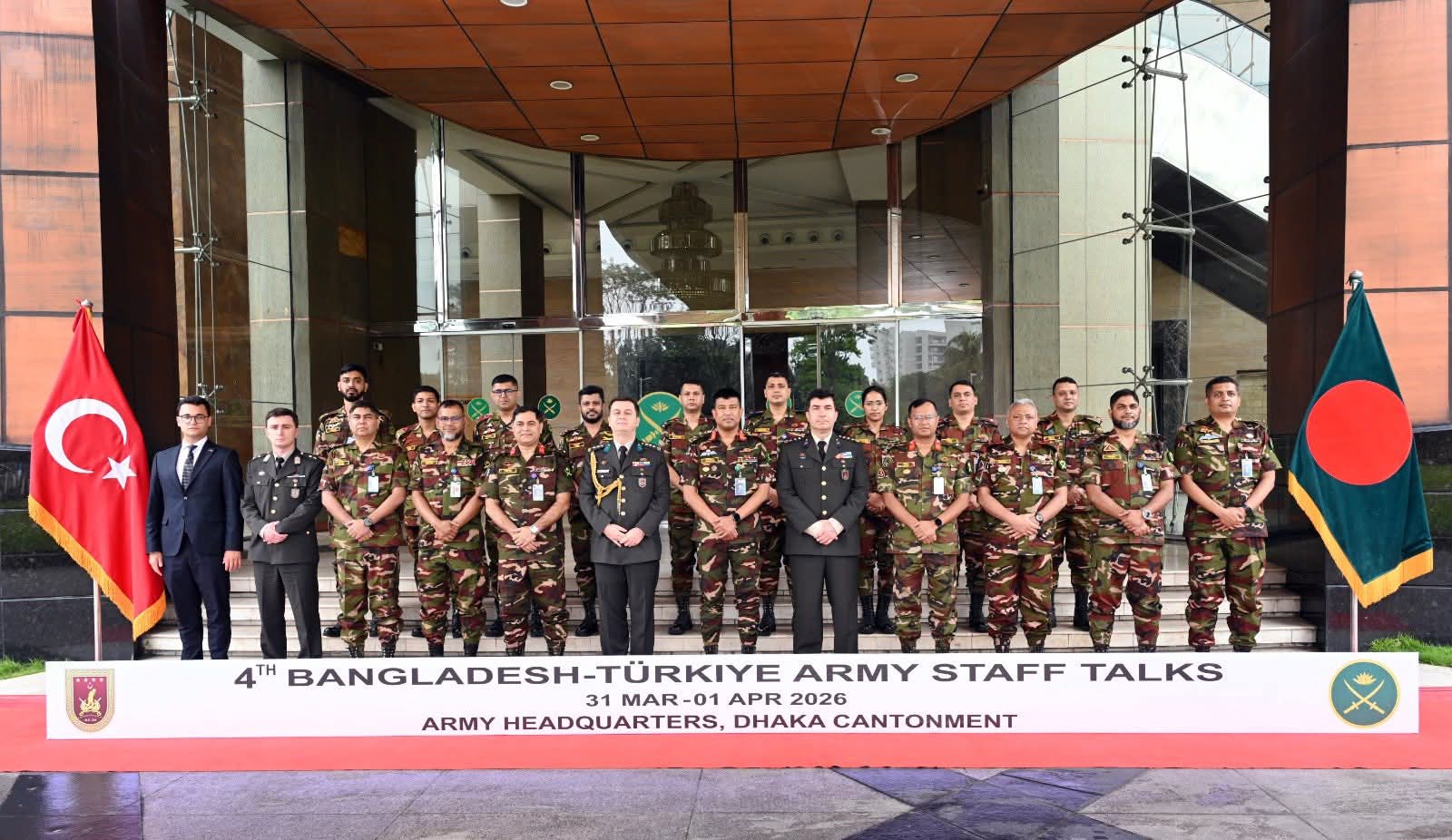 ঢ ০২ এপ্রিল ২০২৬ (বৃহস্পতিবার)আজ ঢাকা সেনানিবাসের আর্মি মাল্টিপারপাস কমপ্লেক্সে ৩০ মার্চ ২০২৬ হতে ০২ এপ্রিল ২০২৬ তারিখ পর্যন্ত ০৪ দিনব্যাপী বাংলাদেশ-তুরস্ক ৪র্থ আর্মি স্টাফ টকস (AST) ২০২৬ এর সফল সমাপ্তি হয়েছে। এই উচ্চপর্যায়ের বৈঠকে উভয় দেশের সেনাবাহিনীর প্রতিনিধিরা অংশ নেন এবং তাদের মধ্যে পারস্পরিক সহযোগিতা বৃদ্ধির জন্য নানা গুরুত্বপূর্ণ বিষয় নিয়ে ফলপ্রসূ আলোচনা হয়।